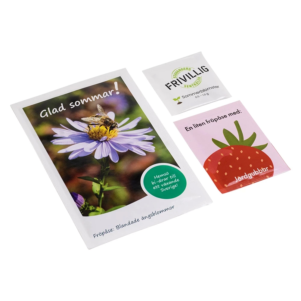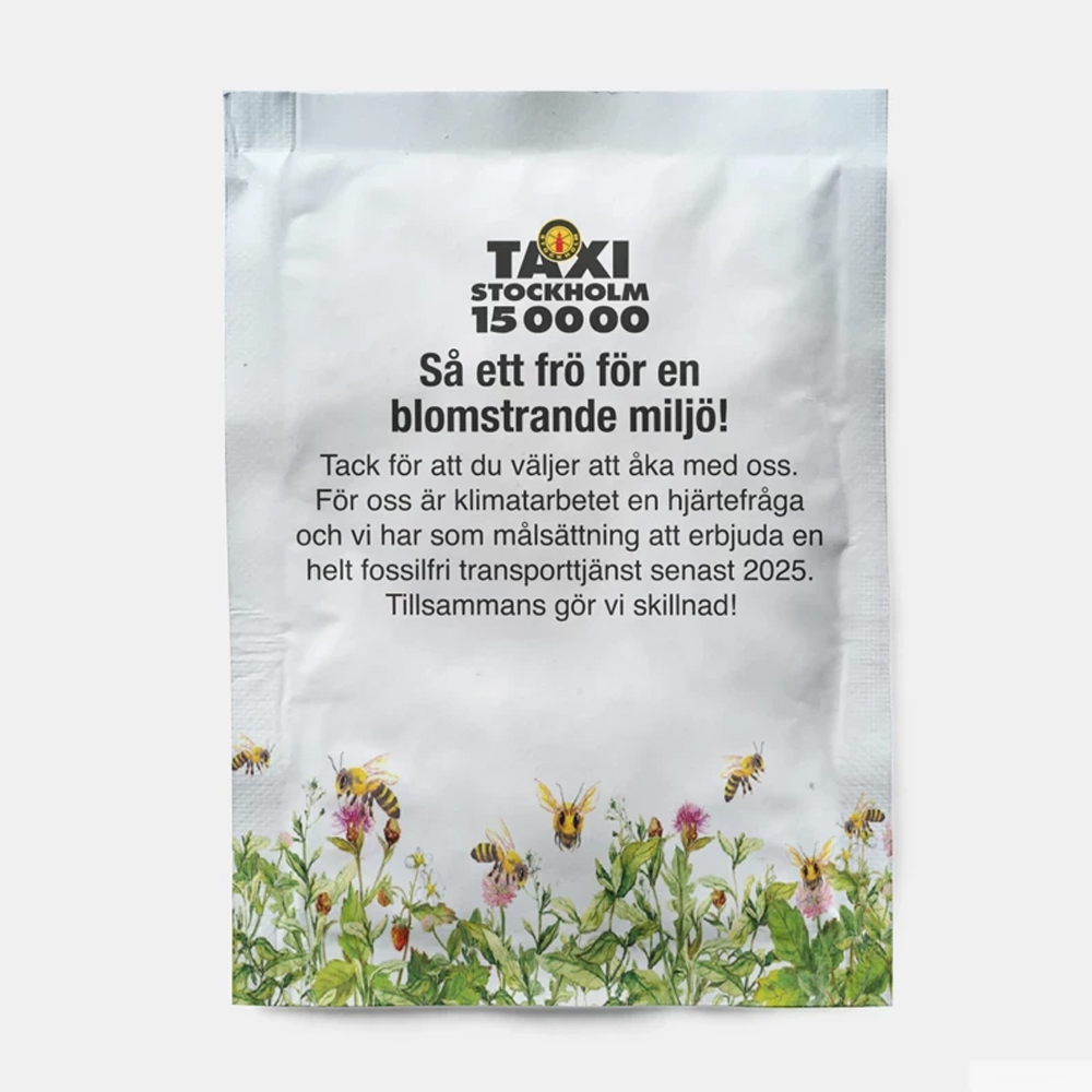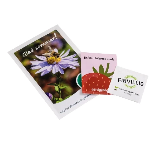 En fröpåse med eget tryck är en kreativ och hållbar profilprodukt som stärker ditt varumärke och skapar minnesvärda kampanjer. Den fungerar perfekt för giveaways, event, mässor, kundaktiviteter och tävlingar, och mottagaren uppskattar den tack vare dess långvariga hållbarhet på upp till 24 månader.